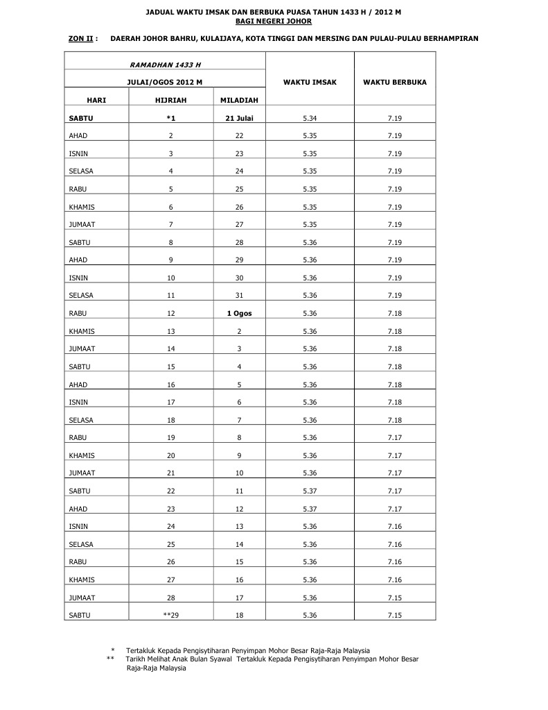 Jadual Waktu Imsak Dan Berbuka Puasa Bagi Negeri Johor Zon 2 Tahun 1433 2012 Pdf